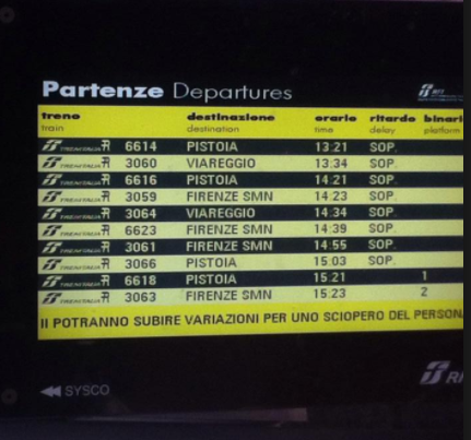 根据官网显示,罢工将在11月23日上午9点开始,并于当日17点结束,总计8个小时。届时列车将有可能延误,改动或取消。 受影响的大区基本涵盖除托斯卡纳大区所有大区:莫利塞,罗马涅,马奇,巴西利卡塔,卡拉布里亚,普利亚大区,翁布里亚,弗留利威尼斯朱利亚,西西里岛,伦巴第大区,阿布鲁佐大区,皮埃蒙特,威尼托,瓦莱达奥斯塔,利古里亚,撒丁岛,坎帕尼亚,拉齐奥,阿迪杰 (Molise , Emilia Romagna , Marche , Basilicata , Calabria , Puglia , Umbria , Friuli Venezia Giulia , Sicilia , Lombardia , Abruzzo , Piemonte , Veneto , Valle d'Aosta , Liguria , Sardegna , Campania , Lazio , Trentino Alto Adige)