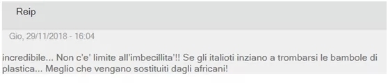 一位网民说到:“难以置信,无下限!如果意大利人都堕落到找充气娃娃了,还不如让非洲人把你们取代了!”