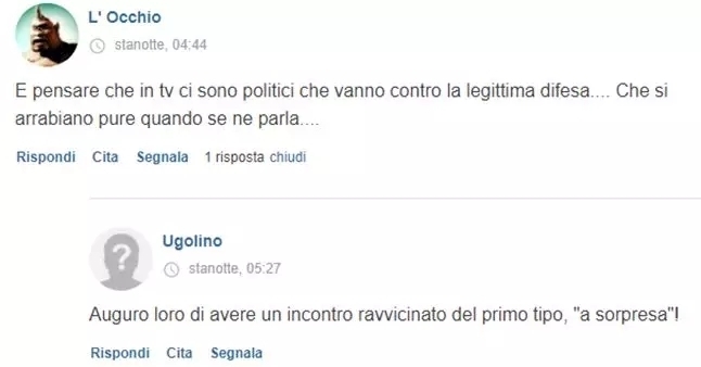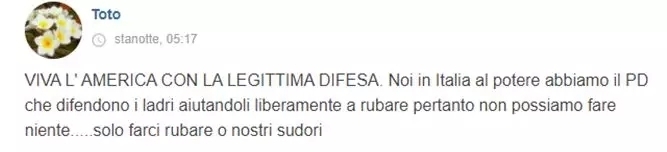——“在美国,正当防卫是合法的,美国万岁!我们意大利曾经的政府是维护小偷的,他们会立刻放了小偷,让他们继续偷。我们什么都不能做,只能任由他们偷走我们的劳动成果。”