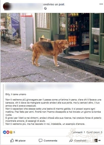 近日在Facebook上, Vietri sul Mare的一位居民写了一篇关于当地一只流浪狗的故事,事情讲述一只流浪狗每天按时去墓地看死去的主人墓碑。