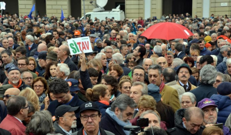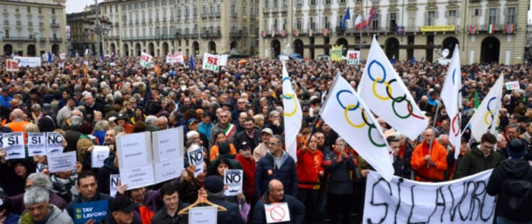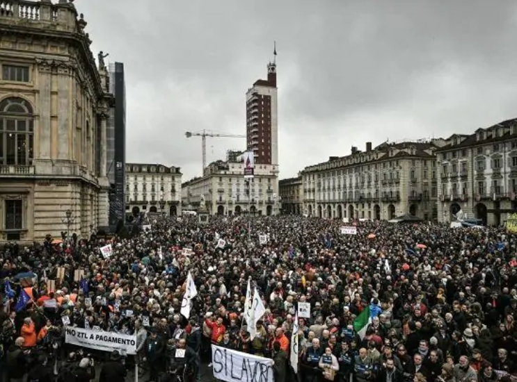 短短两天后的10号,都灵市中心的广场再次被身穿T恤,头戴帽子和橙色围巾的游行人群占据,据估计大约有3万人,其中涵盖了企业家,建筑工人,工会会员,学生等各行各业的人员。他们挥舞着欧盟旗帜和意大利国旗,要求建造铁路。