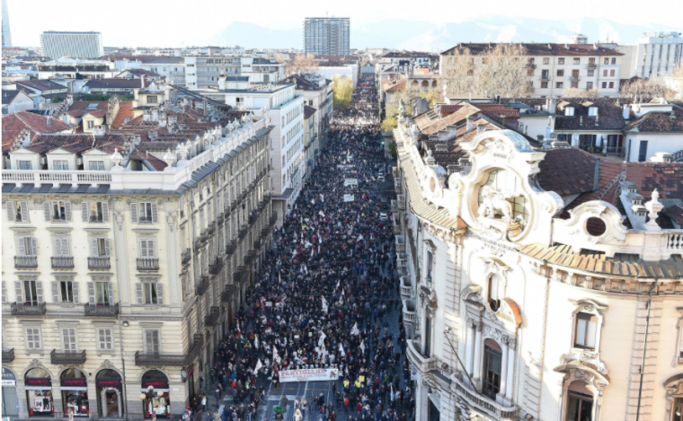 8号下午2点,超过7万民都灵市民从市内 Statuto广场出发,沿着皮埃蒙特首府的街道游行,最终到达卡斯特罗广场(市政府所在地)。人群高举反对都灵到里昂高铁的标语,高呼“我们在这里,现在,永远不要高铁”的口号。