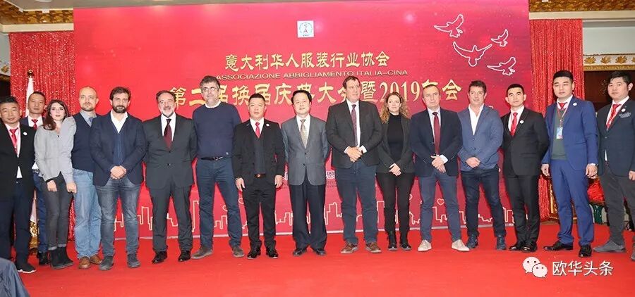 意大利《华人街》讯(记者一策):2018年12月12日,意大利华人服装行业协会第二届换届庆典暨2019新春年会在普拉托市华侨饭店隆重举行,中国驻佛罗伦萨总领馆王辅国总领事、普拉托市副市长Simone Faggi先生等意大利各政府部门官员,以及来自欧洲各国的华侨华人社团代表、华文媒体、中意友好人士逾300名嘉宾出席了当日的活动。