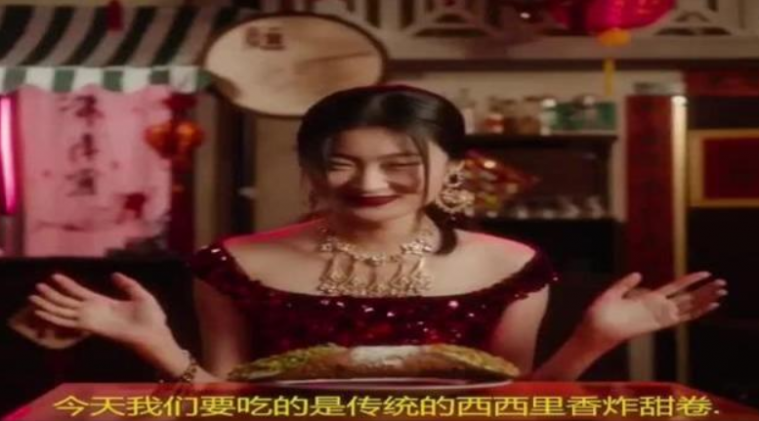 一个身着红衣的中国女孩拿着一双筷子分别坐在一份意面,一份玛格丽塔披萨和一份西西里香炸甜圈前,艰难地尝试(用筷子)享用它们,与此同时,引导着这粗制视频的男声配音没忘了用甜圈的大小玩起双关“这对于你来说太大了?不是吗”