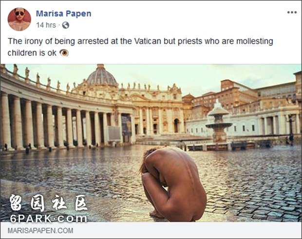 据英国《每日邮报》12月17日报道,上周一,杂志《花花公子》一位备受争议的模特,玛丽莎·帕彭(Marisa Papen)因在梵蒂冈拍摄全裸艺术照被意大利警方逮捕。
