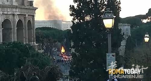 简讯报道:12月18日Roma(罗马)斗兽场附近的Via di San Gregorio街道附近君士坦丁凯旋门前一辆停靠的旅游巴士突然起火。