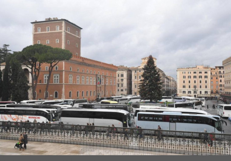 意大利《华人街》报道:在出租车司机持续抗议三天后,罗马的旅游大巴的司机也于今日加入了示威,在罗马市中心真的摆起了大巴。