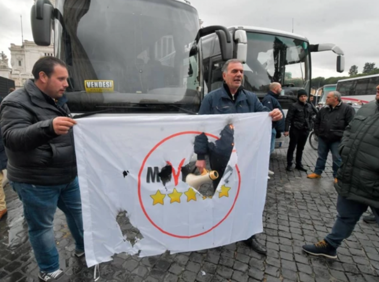 今日在罗马老城区市中心的威尼斯广场(Piazza Venezia),180辆旅游大巴(抗议组织者统计)将广场附近围了个水泄不通,周遭交通因此瘫痪。有激动的抗议者甚至烧毁了五星运动的旗帜。