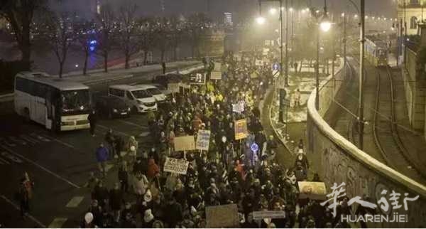 严寒之中,匈牙利人也数次走上街头进行示威游行。出于对右翼民粹主义政府新劳动法草案的愤怒,12月21日晚数千名匈牙利民众再次走上街头举行示威游行。当晚,约5000人在布达佩斯举行抗议活动。示威者们冒着严寒从议会大楼游行至多瑙河对岸的总统府。这已是匈牙利反对派10天内举行的第6次大规模抗议集会,反对派希望在新的一年能组织动员更多的示威者,工会代表也威胁称明年1月将组织全国性的总罢工,教师工会成员更是高呼“必须让国家陷于瘫痪!”引发这番抗议浪潮的原因是匈牙利议会在12月12日通过了一项新的劳动法。根据新法规定, 雇主每年可要求员工最多加班400小时。批评者认为这是一部 “奴隶法”工会担心该法将令昔日的每周6天工作制死灰复燃。