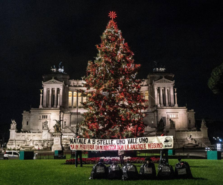 在威尼斯广场的圣诞树前抗议垃圾处理问题