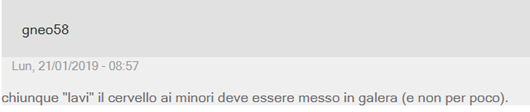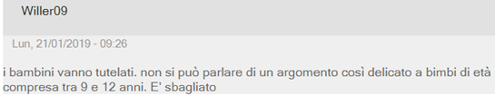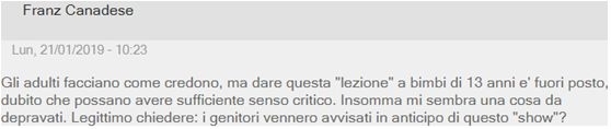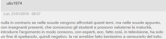 网友Ulio1974说道:“我不反对学校里讨论这些话题,但是在学校里,让那些了解学生并且根据能判断孩子们成熟与否的专家和老师来发起,而不是这样在电视上作秀。Rai电视台就不应该播放这期节目。”