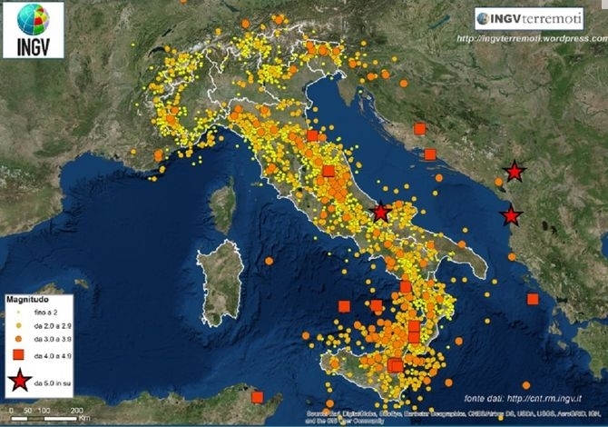 2018年意大利发生的地震中多达90%的地震震级小于2.0级,这意味着几乎不被人们所察觉。震级介于2.0到3.0级之间的地震有2475次;介于3.0到3.9级之间214次。介于4.0到4.9级之间20次(其中周围海域和邻国发生4次,西西里岛埃特纳火山喷发引发5次);5.0级以上的地震有3次(黑山和阿尔巴尼亚各1次,意大利坎波巴索省1次)。值得注意的是,2018年上述地震大多表现为时间和空间上的重新组合。其中地震最密集的是在Amatrice-Visso-Norcia地区,震级较高的则在Campobasso省Molise。此外,埃特纳火山喷发还导致意大利东部和南部地区地质活动更为频繁。2009年拉奎拉地震后,意大利当局对建筑物的抗震性展开全面排查,众多老旧房屋不堪一击。