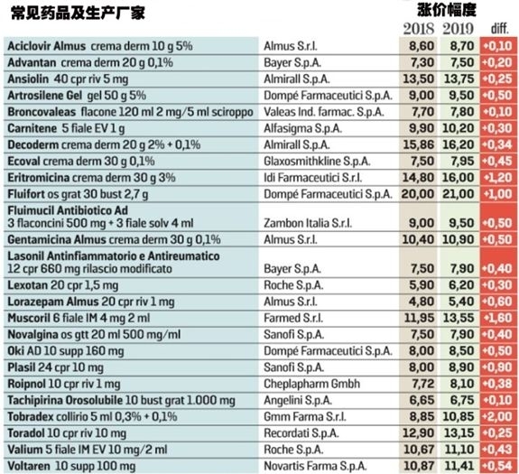 意大利注册药剂师行业公会(Federfarma)公布了此次提价的药物清单。总共770种药物,平均价格从去年的15.58欧元提升至16.47欧元。