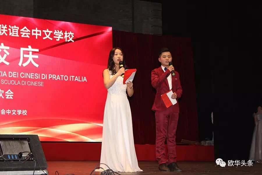 ▲意大利普拉托华人华侨联谊会秘书长陈洪生与特邀主持人周瑶共同主持大会。