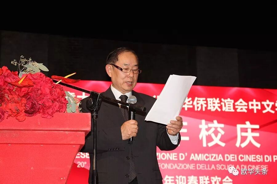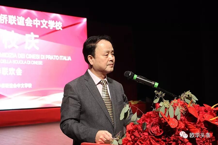 ▲意大利普拉托联谊会会长徐秋林致辞,在中华民族的传统节日——春节即将来临之际,他首先祝大家节日快乐、工作顺利、新年新气象!风雨二十载,芬芳桃李庆华诞,普拉托华人华侨联谊会中文学校自1998年在普拉托创办第一所华文中文学校至今,在总领馆的支持和关心下,已整整度过了二十个春秋!回顾二十年前在联谊会刚刚成立的时候,会长们还在艰苦创业的时候 ,大家在经济条件并不优越的情况下,为了让我们的下一代更好地继承中华民族的优良传统,弘扬中华文化,无私奉献、康概解囊,创办了普拉托第一所中文学校。这二十年来有成千上万的侨胞子女在这所学校接受中文教育,也有很多意大利的孩子来学习,他们一部分已经参加工作,一部分还在求学,在这里打下了良好的中文基础,将对他们未来的发展产生深远影响。