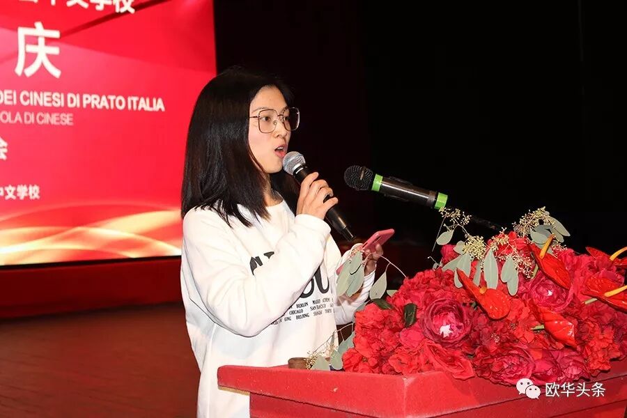 ▲家长代表致辞,她向普拉托华人华侨联谊会中文学校20周年校庆表示祝贺,她表示自己是联谊会中文学校20年前的第一批学生,20年后的今天,她的两个孩子也就读于这所学校,看着孩子的中文水平一步步的提高,她非常感谢老师们的努力付出,希望母校规模越来越大、教育质量越来越好!