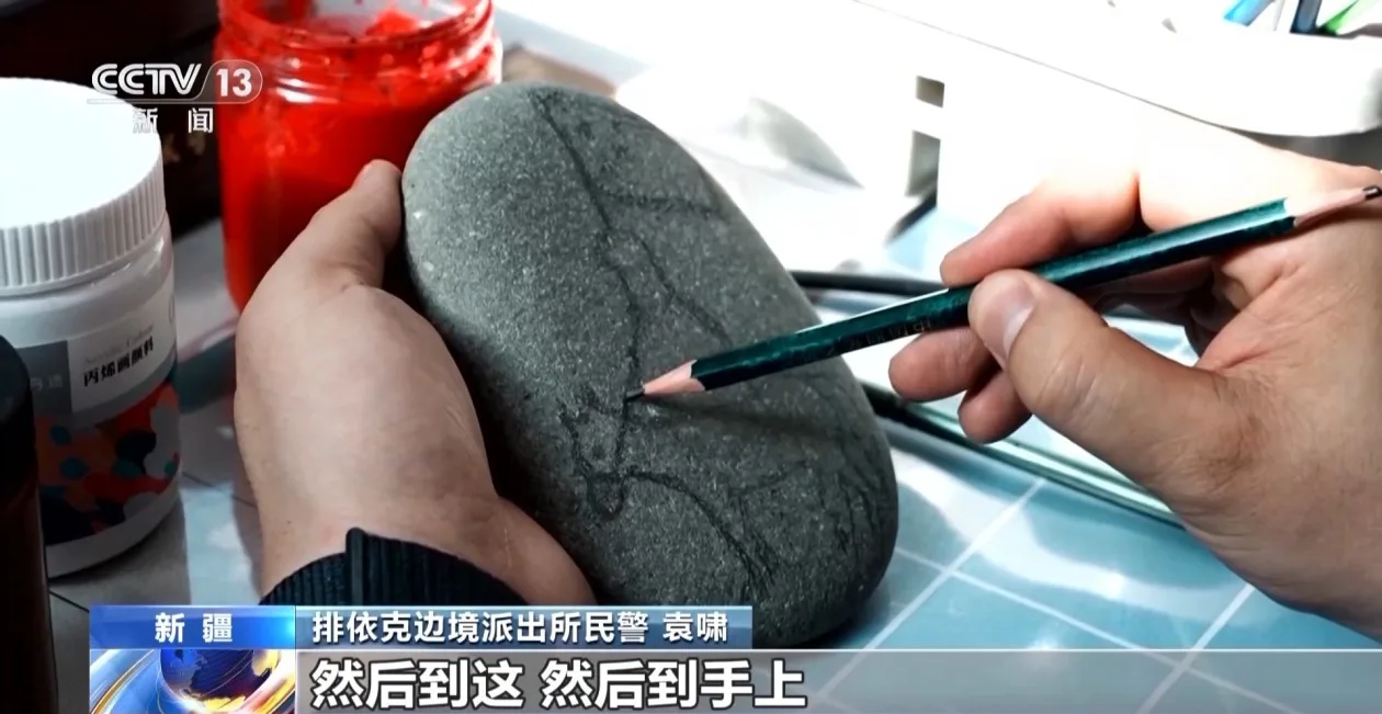 排依克边境派出所副所长 肖恭尼·龙吉克:因为我们所距离最近的喀什市有400多公里,所以民警娱乐活动比较单一,平时在边境开展巡逻的时候会将自己喜欢的石头带回来画画。