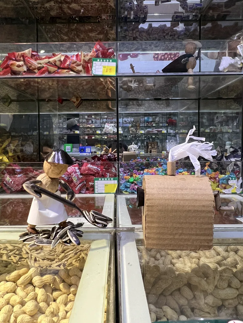 “材料一不搭,整个人就显得别扭。”每次创作,他都要抓出一把炒货,在桌前反复比对、筛选。“这些挑出来的炒货没法再卖了,最后基本都进了我自己的肚子。”他笑着说,“所以,父母每次看到我做手办,都觉得我是在浪费粮食、不务正业。”