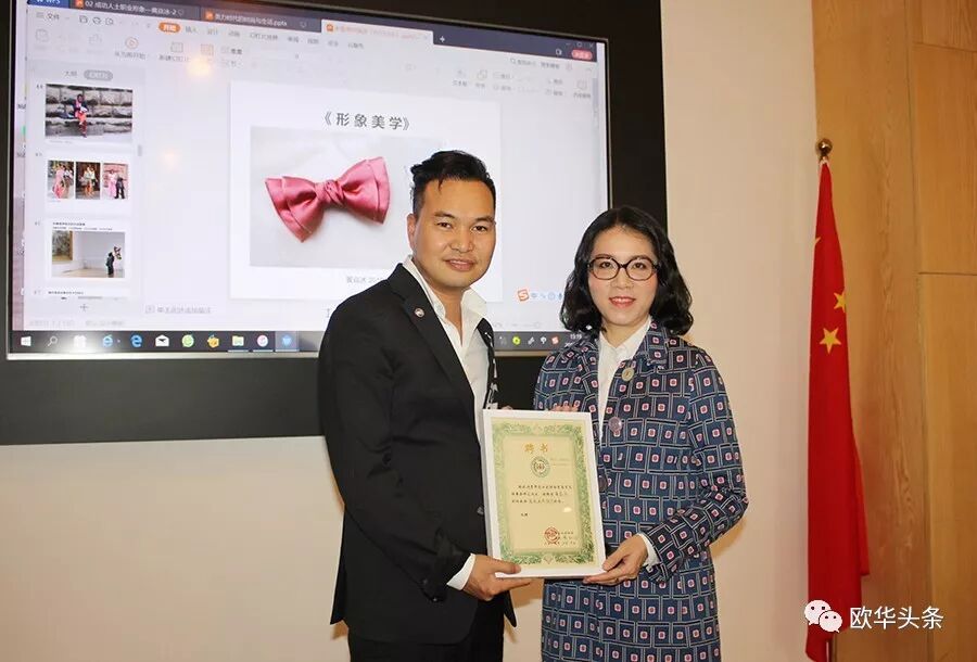 黄勤海会长特聘黄焱冰担任欧洲青年企业家协会“高级美学顾问”; 黄焱冰教授将自己潜心十年书写的专著《形象美学》赠予协会。