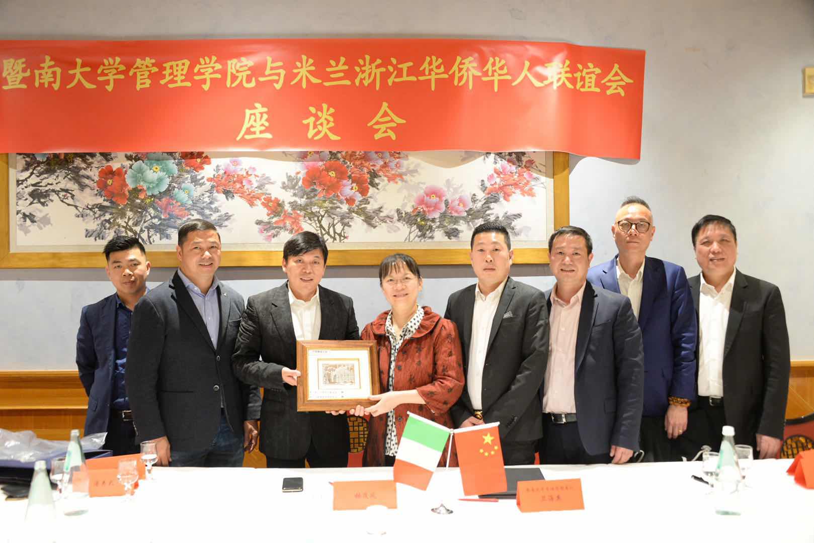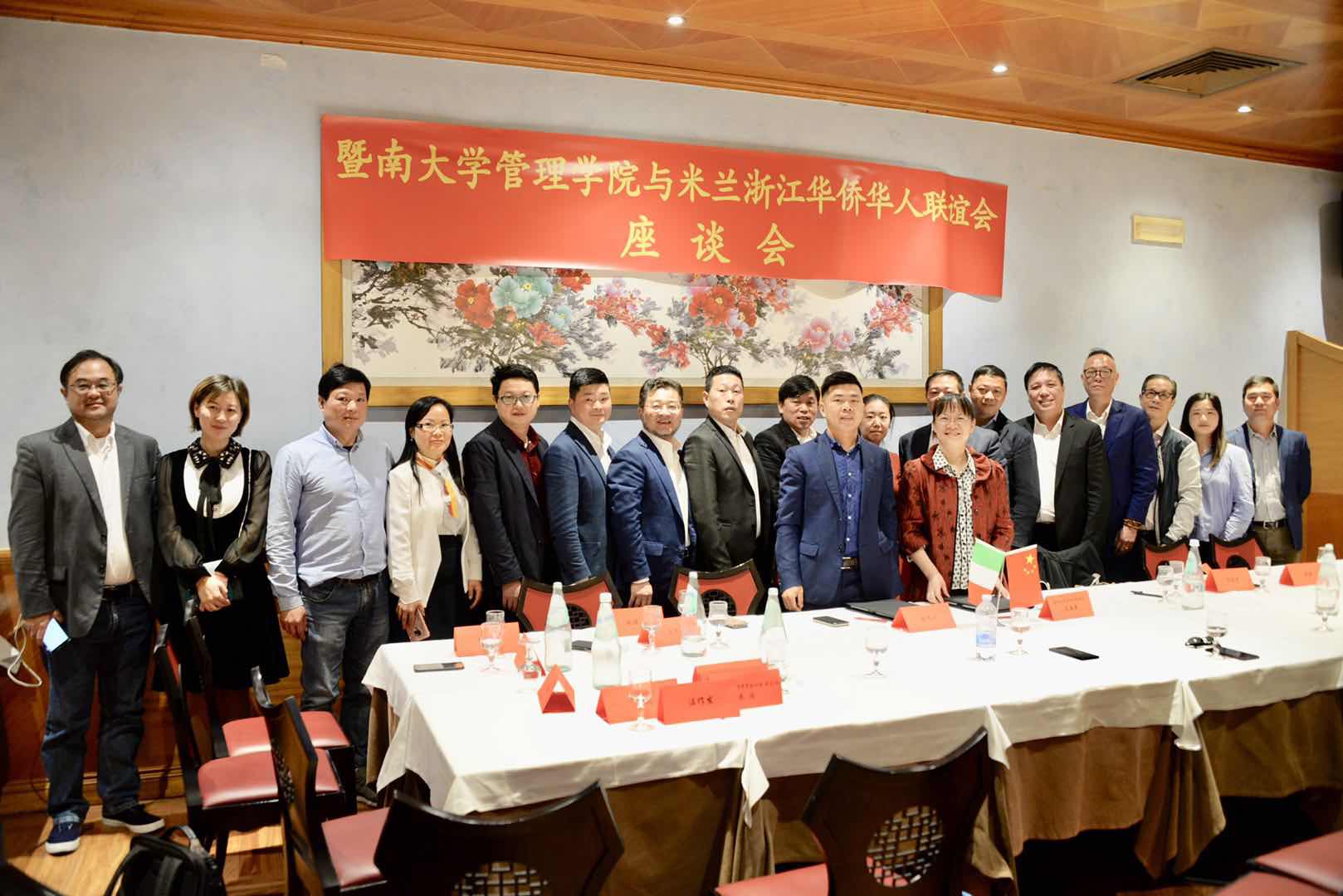 中国驻米兰总领馆领事孟蕊、暨南大学管理学院党委书记卫海英、暨南大学管理学院会计系副主任朱滔及代表团成员,米兰浙江华侨华人联谊会朱金亮、林茂风、赵焕青、潘寿式等人出席了座谈活动和签约仪式。