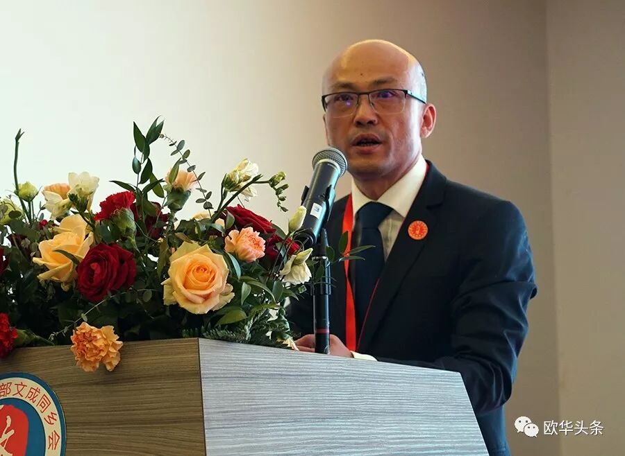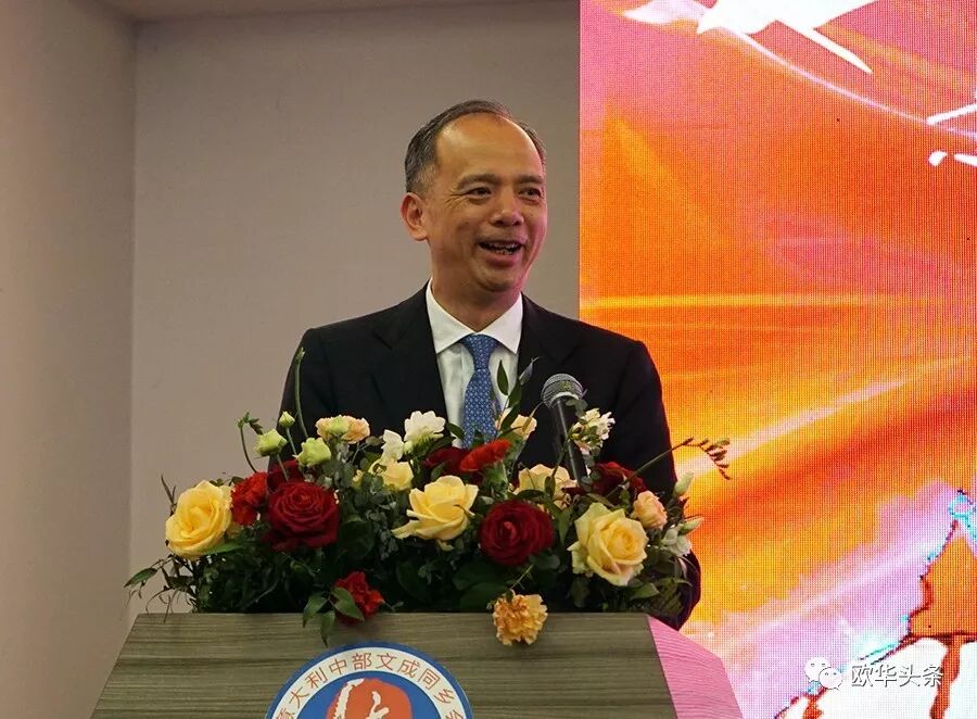 王文刚总领事在文成同乡会换届庆典大会上发表讲话,他代表中国驻佛罗伦萨总领馆全体工作人员,对同乡会的成功换届,对胡寨弟先生荣任新一届会长表示热烈祝贺。