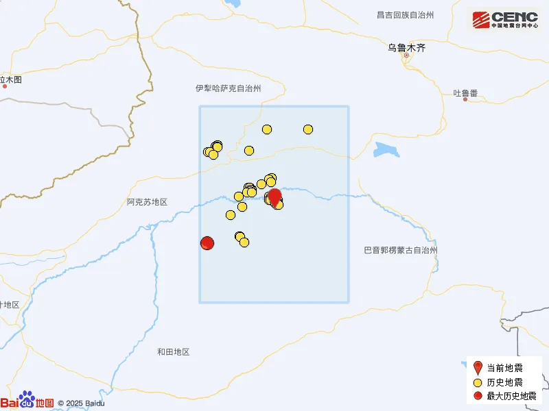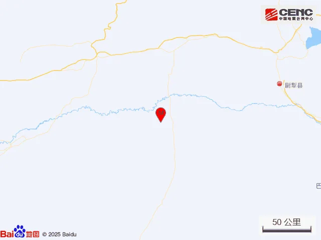 速报参数:据中国地震台网正式测定,2月13日1时40分在新疆巴音郭楞州尉犁县发生4.6级地震,震源深度19公里,震中位于北纬40.85度,东经84.08度。