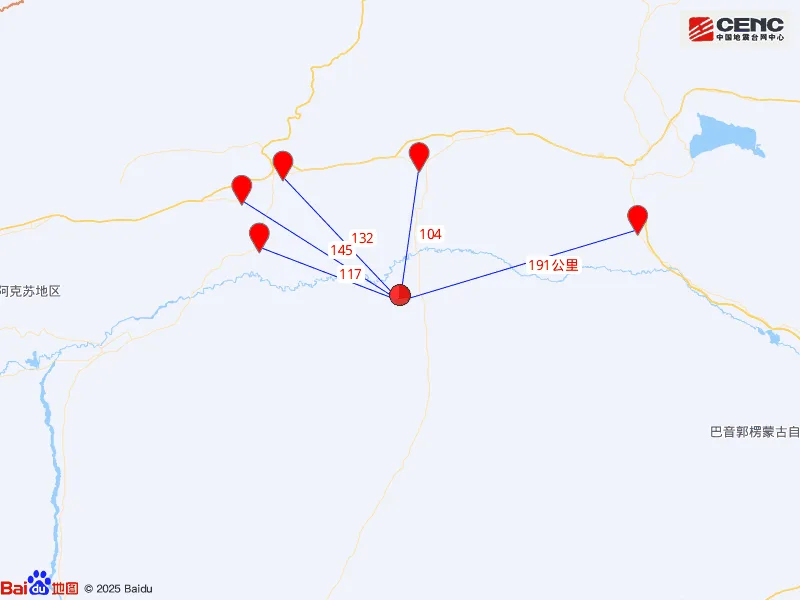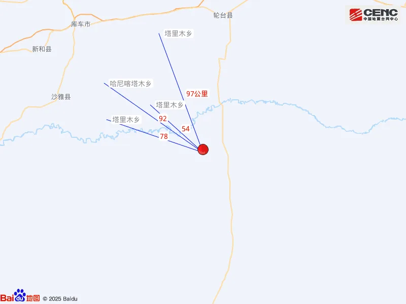 周边县城:震中距轮台县104公里、距沙雅县117公里、距库车市132公里、距新和县145公里、距尉犁县191公里,距铁门关市174公里,距乌鲁木齐市439公里。