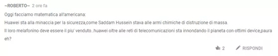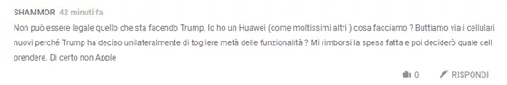 网民@SHAMMOR:特朗普现在正在(对华为)做的事情并不合法。很多意大利人都在使用华为手机,我也是其中之一,特朗普现在要关闭华为手机的一半功能,那我们现在要怎么办?把手机扔了吗?(这样的话,他)就应该给我们报销买手机的费用,然后我们再决定去买其他手机,但肯定的是,我们不会买iPhone。