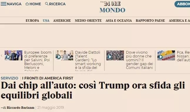 意大利最大的经济金融类日报《24小时太阳报》近日发表题为《从芯片到汽车:特朗普挑战全球平衡》的评论员文章。文章称,在“美国优先”这一理念指引下,美国政府近期出台的华为禁令仅仅是特朗普在世界范围内挑战全球秩序和战略平衡的最新行动,而这一错误理念和做法将严重拖累世界经济发展进程。欧洲国家普遍对美国政府的一系列不当行为可能对世界经济发展带来的负面影响表示担忧。近几个月来,美国针对华为围追堵截,先是质疑华为产品存在“后门”,后又攻击华为抄袭美国产品、指控华为违反对伊朗制裁。然而,上述种种指控不仅语焉不详且并没有真凭实据。