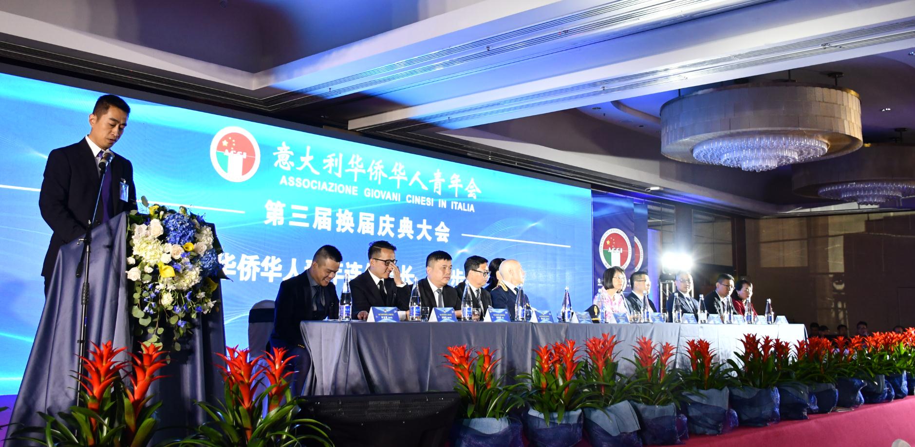 当晚的喜来登大酒店隆重而典雅,意大利华侨华人青年会秘书长李志恩主持。随着意大利华侨华人青年会执行会长潘育平宣布大会开幕,全场凑响庄严的中意两国国歌。