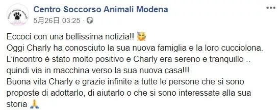 为了尽快给Charly找到新家,摩德纳动物救援中心曾在Facebook上发布了救助信息。