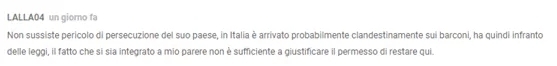 网友@LALLA04 :“没有回国后遭受迫害的危险,他很可能是坐难民船非法抵达意大利的,所以已经违反了法律。在我看来,“他已经融入意大利”这一点不足以允许他继续留在意大利。”