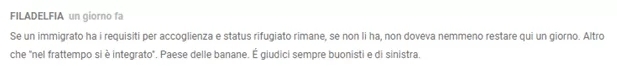 网友@FILADELFIA: “如果一个移民有资格取得难民身份,可以留下来;但如果他没有,就一天都不能逗留,不管他是否‘已经融入’。意大利就是‘香蕉共和国’(拥有不民主或不稳定的政府,特别是那些拥有广泛贪污和强大外国势力介入之国家的贬称)。这些法官都太仁慈了。”