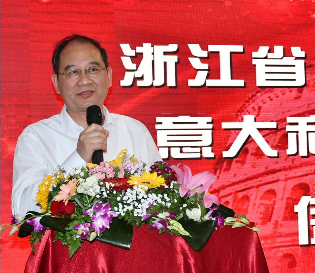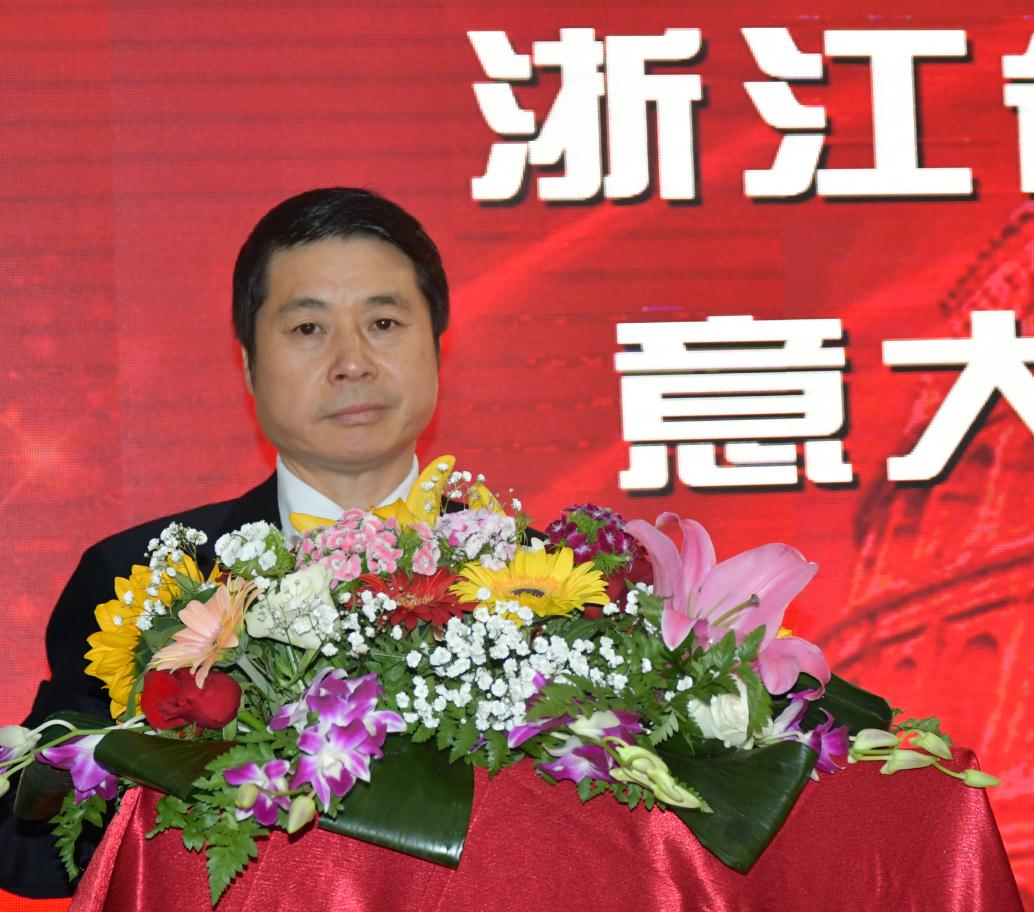 浙江省人大常委会李火林秘书长向意大利华商总会洪森淼会长赠送纪念品