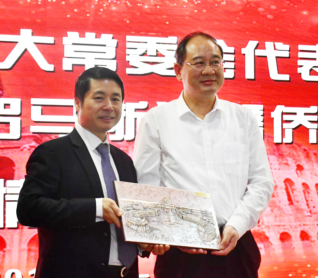 意大利华商总会洪森淼会长向浙江省人大常委会李火林秘书长赠送纪念品