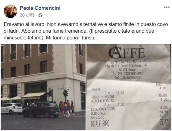 意大利Fanpage网站报道,服装设计师和舞台布景师Paola Comencini近日在其脸书(Facebook)上称其在罗马一家餐厅消费时“被坑”。