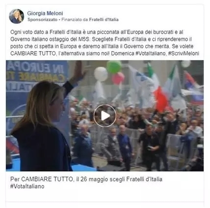 意大利兄弟党主席乔治亚·梅洛尼公共主页的花费约3.5万欧元。显示的投资方为意大利兄弟党(Fratelli D’Italia)。