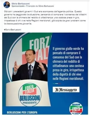 贝卢斯科尼推送这个帖子的目标用户是女性。这个广告专门针对南方人,因此该广告更多的推送用户在坎帕尼亚大区(33%)、西西里(28%)和普利亚大区(19%)。