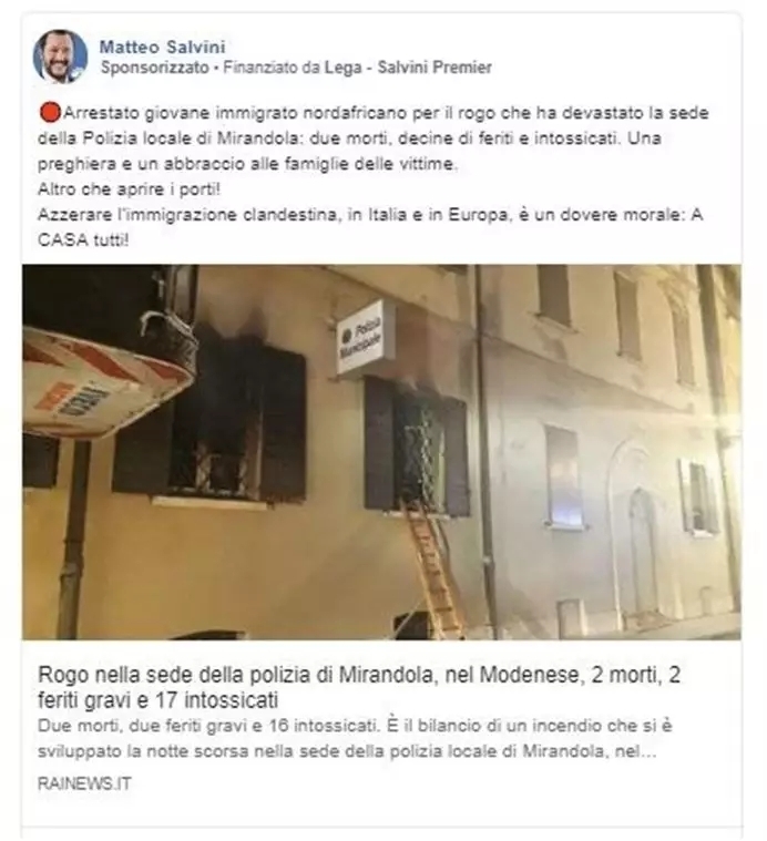 据脸书广告资料库信息显示,萨尔维尼发布的一个帖子(关于一名年轻北非人被逮捕,上图)的花费为1000至5000欧元,该帖子被浏览超过100万次,浏览者大部分来自伦巴第大区(占14%)和拉齐奥大区(12%)。推送的目标人群是45至64岁的男性。