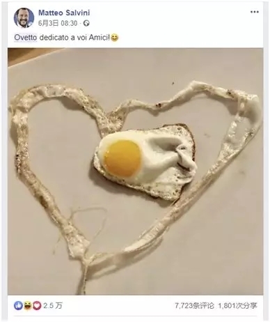 平时很可能你们经常会发现这样一种情况,你还没起床就已经收到了推特/脸书的通知,一看,又是哪个政客更新他的社交网络了。如下图,6月3日一早,萨尔维尼就发了一条帖子,写道:“朋友们,这个煎蛋是献给你们的!”文字下面还有一个心形煎蛋的图片。