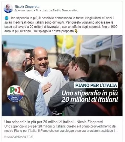民主党总书记兼拉齐奥大区主席津加雷蒂的投资方为民主党(Partito Democratico)。5月的脸书广告投资额远低于其他政治领导人——仅1417欧元。