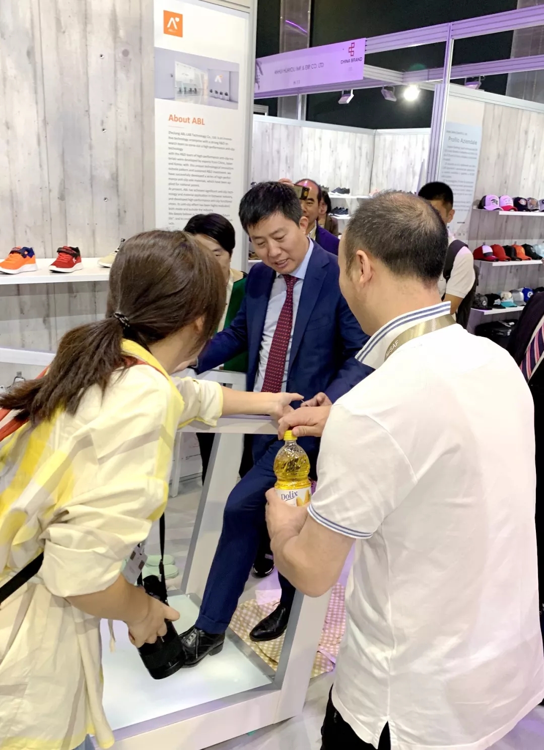 中国驻米兰总领事馆商务参赞李少峰,亲自走上安宝乐展厅里的体验台,体验了安宝乐黑科技产品,连赞不绝。他认为,中国制鞋业融入了高科技新材料非常好,打破了中国鞋业品牌的传统形象。其他的嘉宾也纷纷走上了体验台,切身体验感受到“穿上安宝乐止滑鞋真的能在水面、油面上正常行走滑不倒的超强体验感。”
