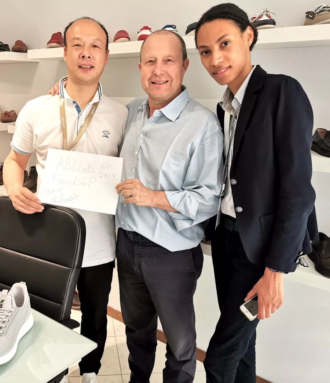 一位意大利鞋业资深的品牌运营商在展会一起体验了安宝乐止滑鞋并了解了品牌文化,非常兴奋。他介绍说自己在欧洲有很多的资源和客户,他希望能在意大利代理运营安宝乐品牌的产品,给意大利人民带来多一份的安全。并当场发出邀请郑国超团队去他的公司进行参观和考察。盛情难却之下,一行人便驱车一个多小时,于当天中午来到了他的公司,经过一番详细的介绍及合作细节的交流,双方达成初步协议,在他强烈的合作意愿下,主动提出在8月份带团队来中国进行正式的业务洽谈及正式协议的签署。