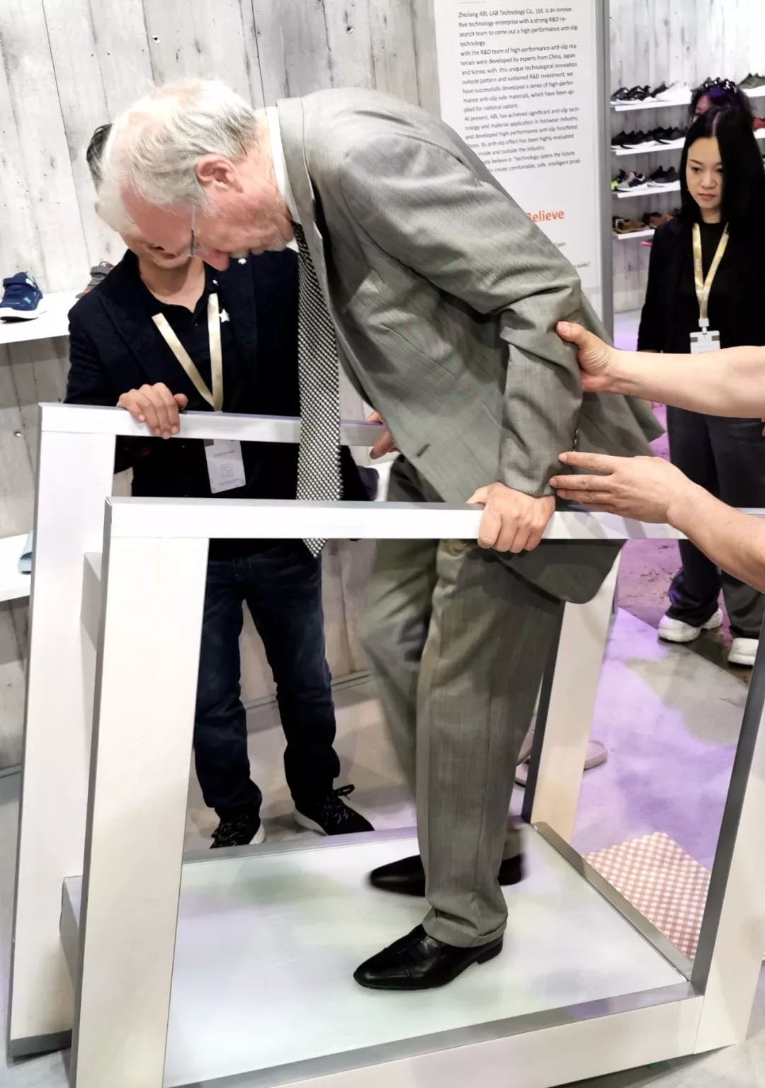 一位上了年纪,头发花白的老人也走上了体验台,体验效果让他震惊,他伸出了大拇指,为中国科技止滑鞋点赞。他就是意大利马尔凯经济开发部Raimondo Orsetti 部長,在过去的二十多年里,他为中国与意大利的商业合作做出了卓越的贡献,他希望未来中国会有更多的优秀品牌进入意大利,他表示中国应该要更多类似安宝乐这种注重自主研发、创新的品牌进入国际市场。