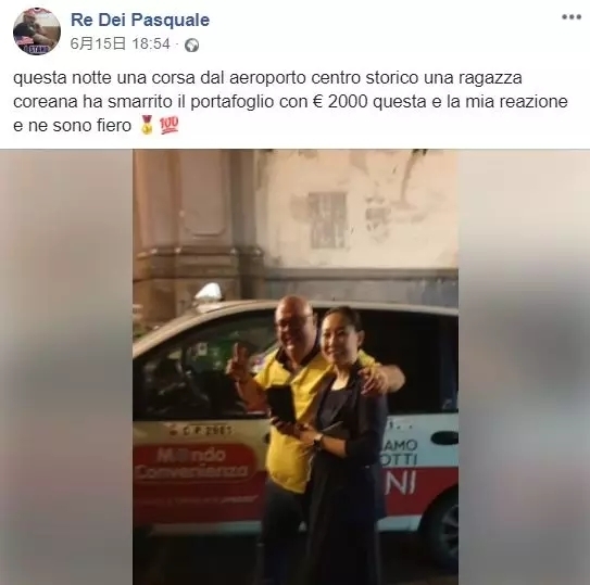 意大利Napolitoday网站17日报道,这位好心的司机名叫Pasquale Re Dei。近日,他从那不勒斯机场搭载一名韩国游客前往老城中心。乘客下车后,他在车内发现了该游客遗落的钱包,里面装有2000欧元的现金、机票、信用卡等重要物品。Re Dei想办法联系上了该游客并将钱包等钱物悉数归还。