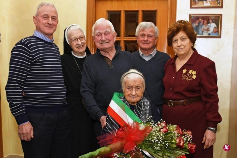 116岁的意大利人瑞罗布齐(前)与五个孩子的合照。(互联网)