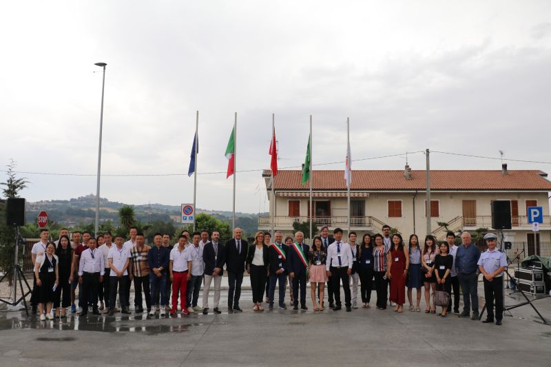 monteleone di fermo市市长和味美员工代表 matteo michetti同时升起Itaci和味美食品的厂旗
