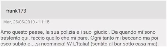 网友@Fank173:我在我们家楼下的酒吧听到一个人说他超爱意大利这个国家,从他来到这里就为所欲为,虽然有时会被抓住,但很快就被放出来。威武意大利!