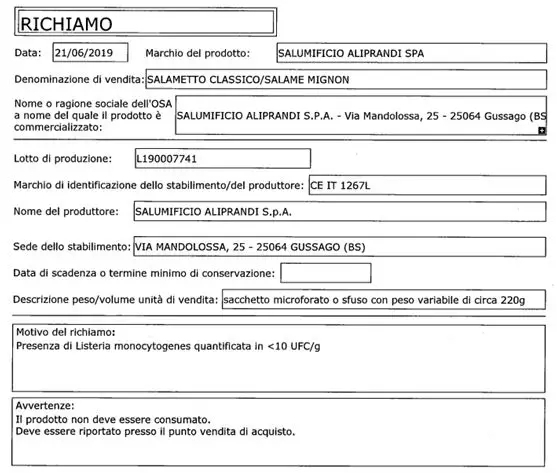 6月25日,卫生部在其官网上宣布召回2款萨拉米香肠“salametto classico”和“salame mignon”,均由Salumificio Aliprandi Spa公司在布雷西亚省古萨戈市(Gussago)的生产点生产。规格为散装220克左右,生产批号为 L190007741。召回原因为可能感染李斯特菌。