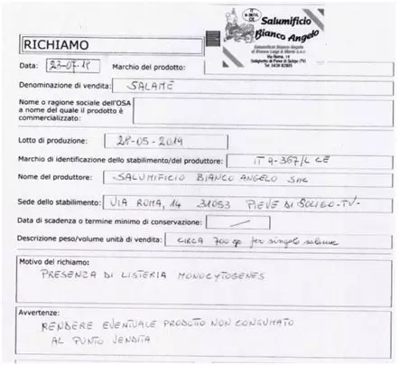 由于存在李斯特菌污染风险,意大利卫生部23日宣布召回一款由特雷维索省(Treviso)的Salumificio Bianco Angelo Snc公司生产的萨拉米香肠(Salame)。